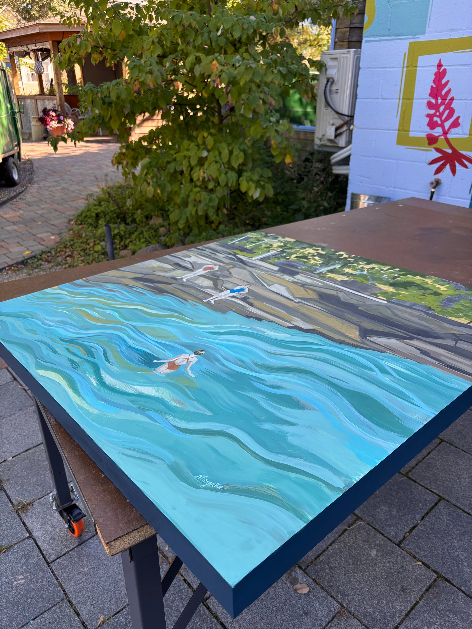 Latex paint (underpainting) and Holbein Acryla Gouache on a 36 x 36 inch x 2 inch cradled wood panel.