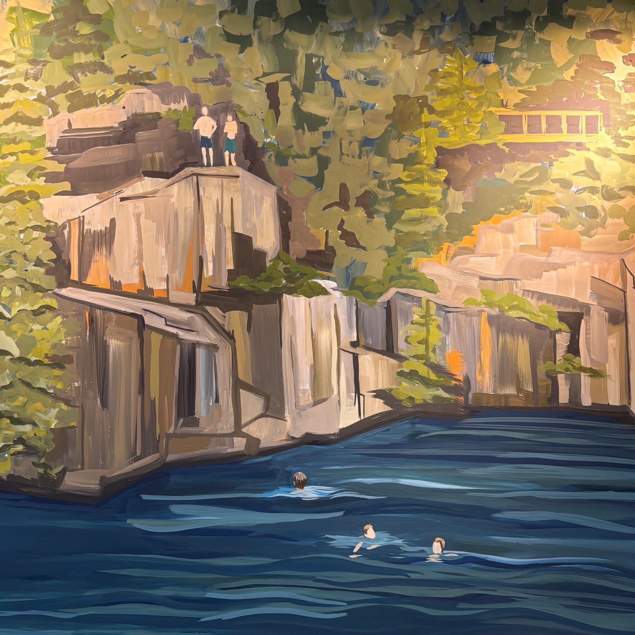 I considered calling this painting 'Right of Passage.' Cliff jumping at Quarry Park in St. Cloud, MN, is quintessential summer around these parts. Side note: I decided that the smaller cliffs at Quarry #11 were more my speed, and I left the high cliffs at Quarry #2 to the younger and more adventurous swimmers.